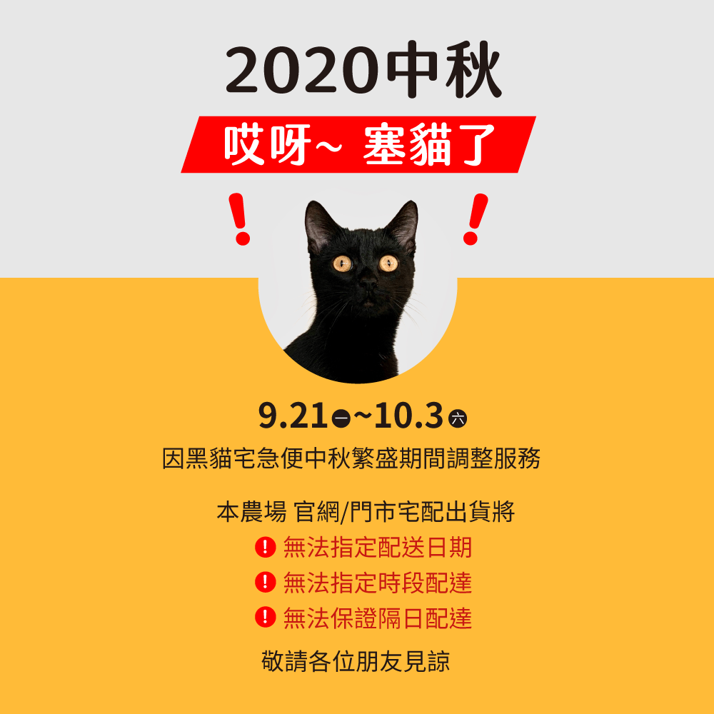 也就是說,原本「今天買、明天發貨,後天~大後天可以收到」,因為黑貓中秋節前夕寄件需求大增、宅配塞車的情況下,可能要「多等好幾天才能收到」喔~!