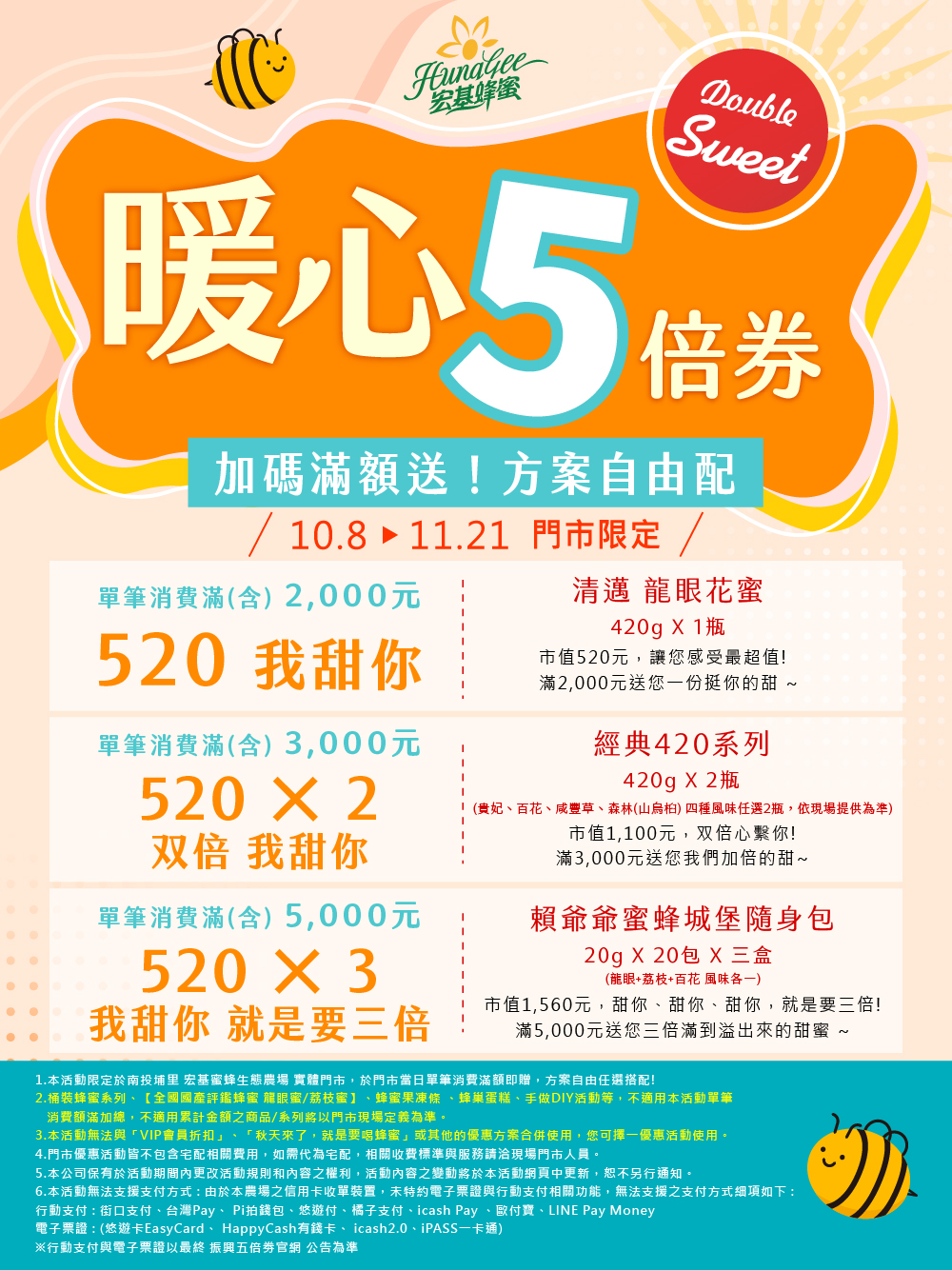 3. 單筆消費滿(含)5,000元, 送您「520×3 我甜你 就是要三倍」