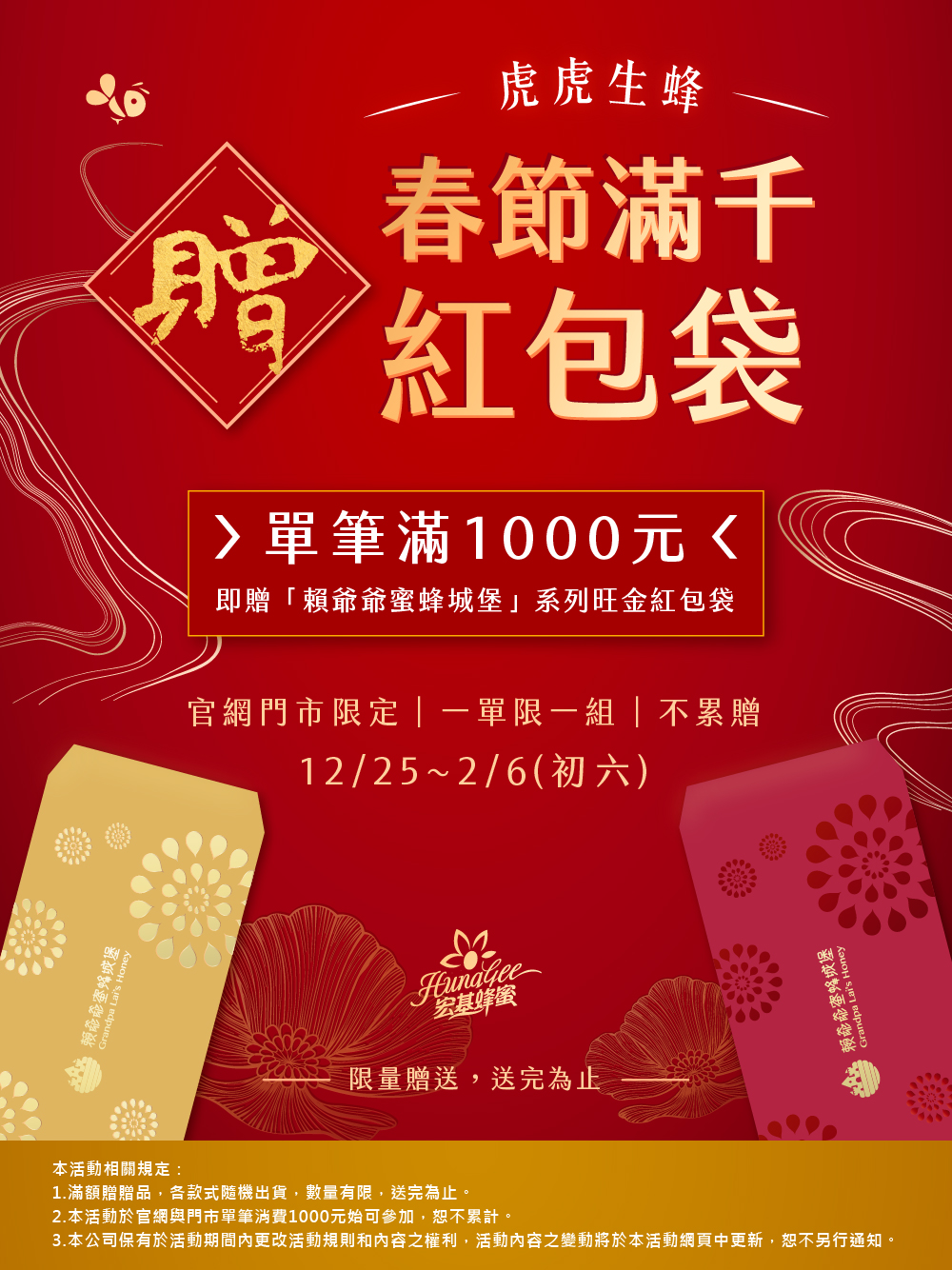 「虎虎生蜂 春節滿千『贈』紅包袋」優惠活動內容 :