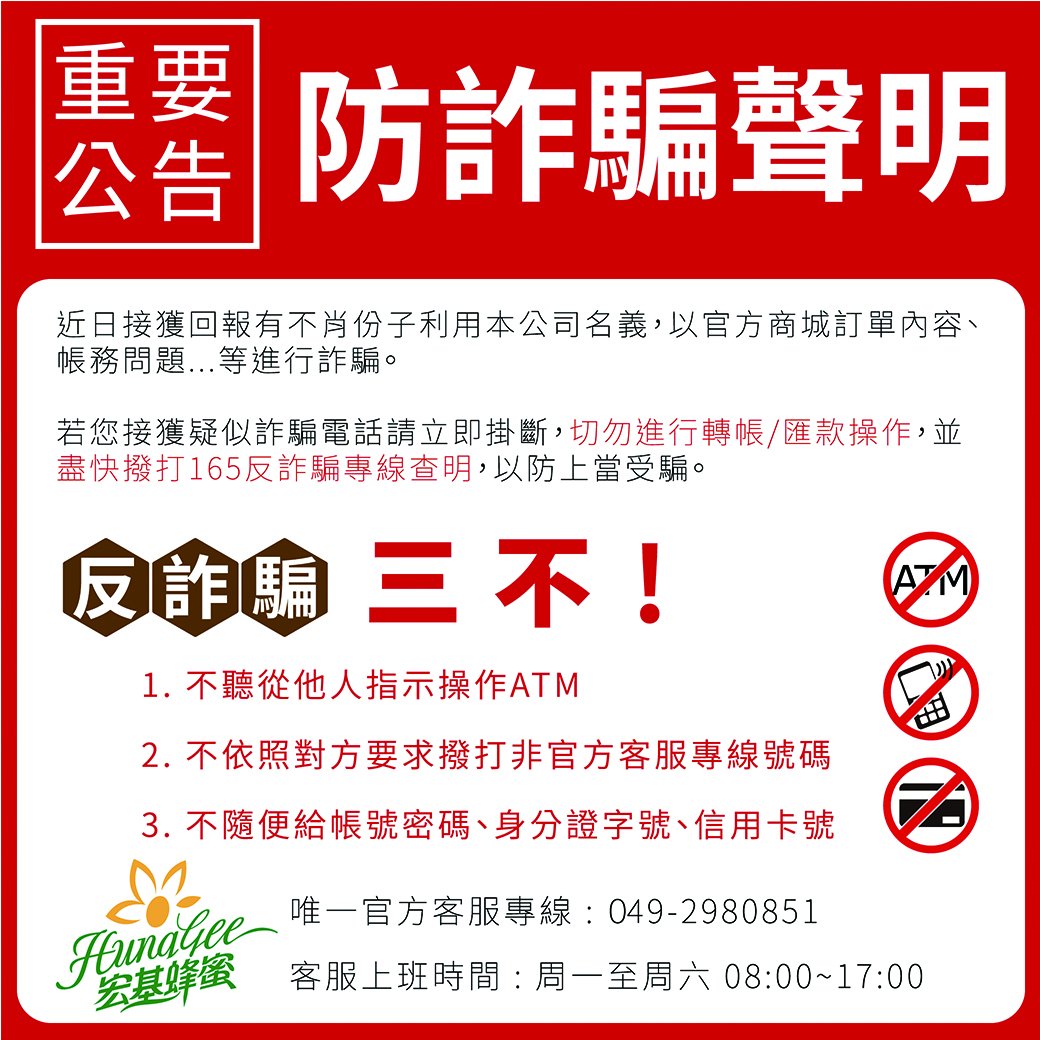 若您接獲類似電話或簡訊,請立即掛斷電話,並撥打「165」反詐騙專線求證(24小時服務),您可於宏基蜜蜂官方FB粉絲頁私訊,或於營業時間致電於本公司客服專線「049-2980851」詢問,確保您的權益。