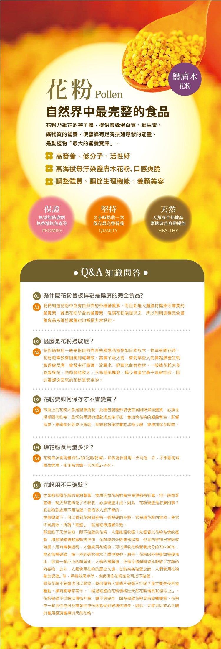 ●品名:鹽膚木花粉●容量:250g/瓶●成分:花粉●原產地:台灣●保存期限:一年 ●保存方法:常溫不宜曝曬,避免受潮。●使用方法:即食、以飲料、開水、果汁等佐之,亦可沖泡牛奶、咖啡,視個人喜好自行調製,尤以添加蜂蜜水,冰涼風味更佳;以吐司、麵包、饅頭、壽司等同時食用亦佳。