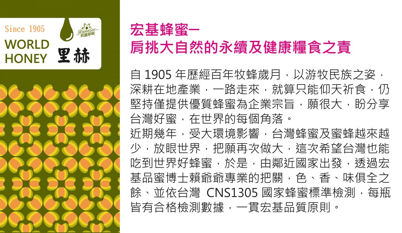 泰國龍眼蜜的風味相對台灣龍眼蜜來的清香,色澤也較淡。 近年來,受大環境影響,台灣蜜源逐漸減少,因此宏基放眼海外,尋找品質優良的穩定蜂蜜來源。 來自泰國清邁的蜜源,因氣侯怡人,龍眼花開時降雨量少,蜜源充足豐富。