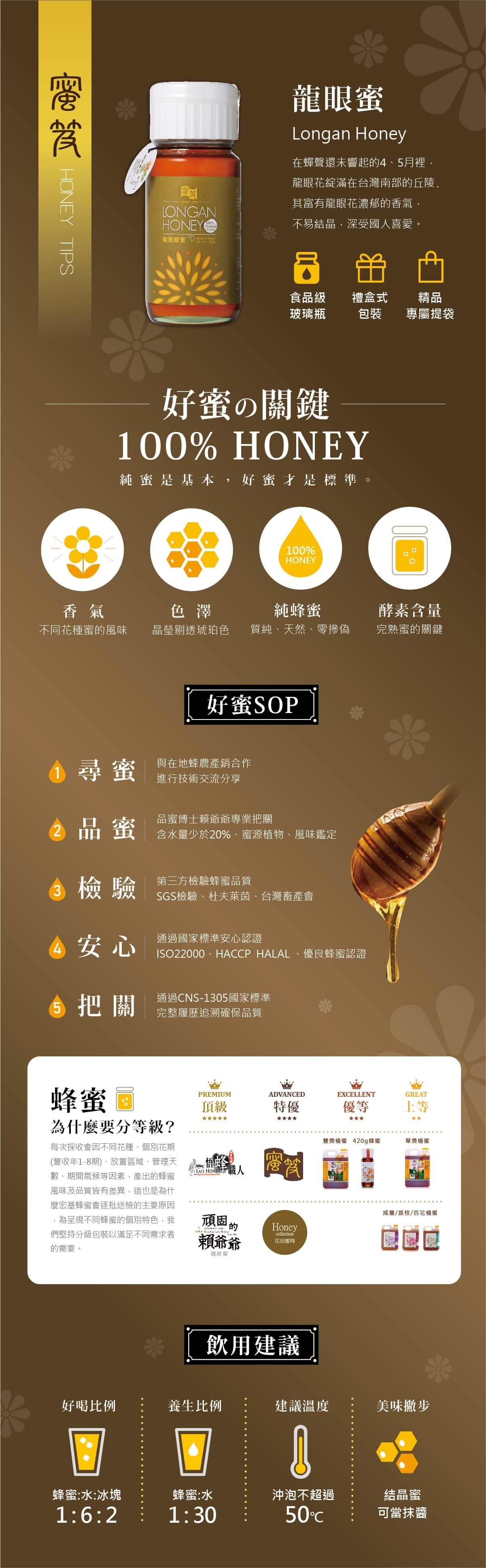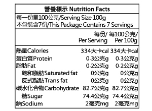● Product Name:Meiji Longan Honey [TAP] 700g● Capacity: 700g/bottle● Ingredients: 100% Pure Honey (Taiwan)● Origin: Taiwan● Shelf Life: Two years● Expiration Date:Must be shipped at least 240 days before the expiration date.● Nutrition Facts: See the graphic for details.● Storage:Do not refrigerate or expose to direct sunlight. Store in a cool, dark place away from water.● Usage:Can be dissolved in cold or warm water and then added with ice cubes or fruit slices.Can be mixed with milk or coffee or used as a spread, dip, or seasoning.● Precautions:1. Not suitable for children under eight months old.2. Do not consume with foods containing gypsum, raw crustaceans, or raw oysters (two hours apart).3. Honey is a commercial product; the quality of each batch may vary depending on climate and environment.4. Crystallization is a natural transformation of the seed crystal; use with confidence.
