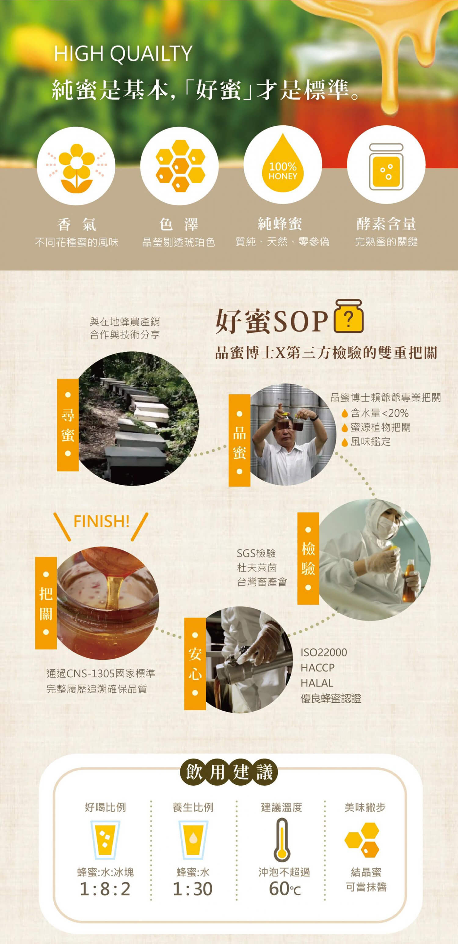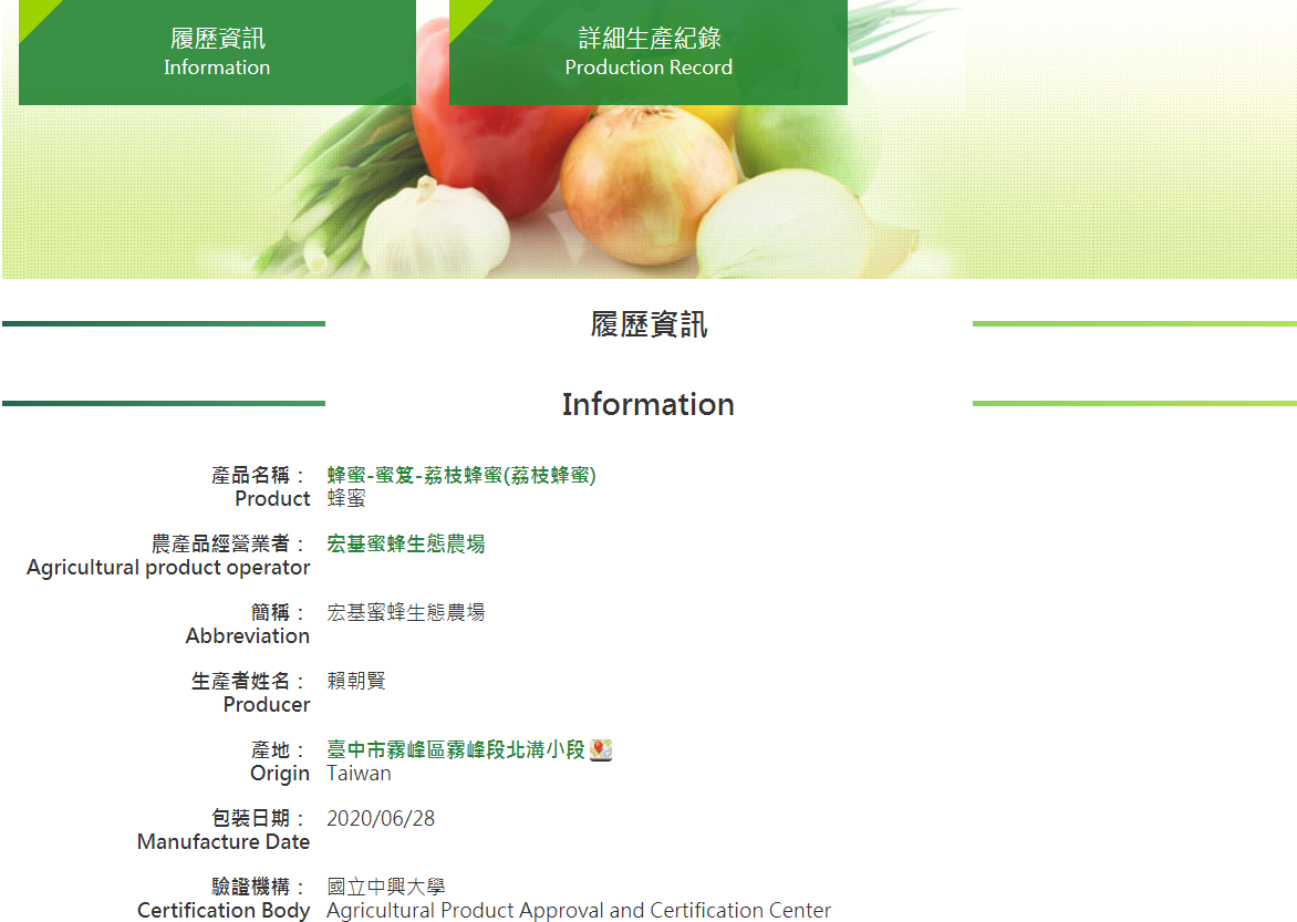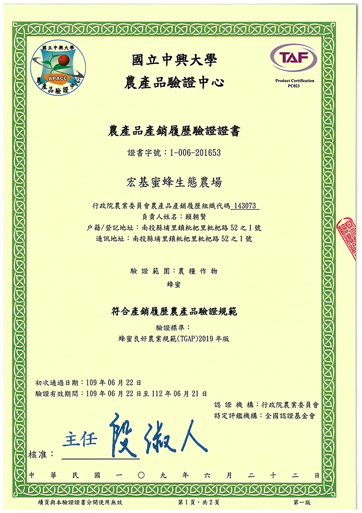 • Carefully selected single-origin honey from a single production area in central Taiwan • Certified by the TAP Honey (TAP:Taiwan / Traceability Agricultural Product 產銷履歷農產品) • Bears the Taiwan TAP production and sales record inspection mark • Quality standards exceed Taiwan's national standards • Competition honey grade, with pure aroma and flavor carefully selected
