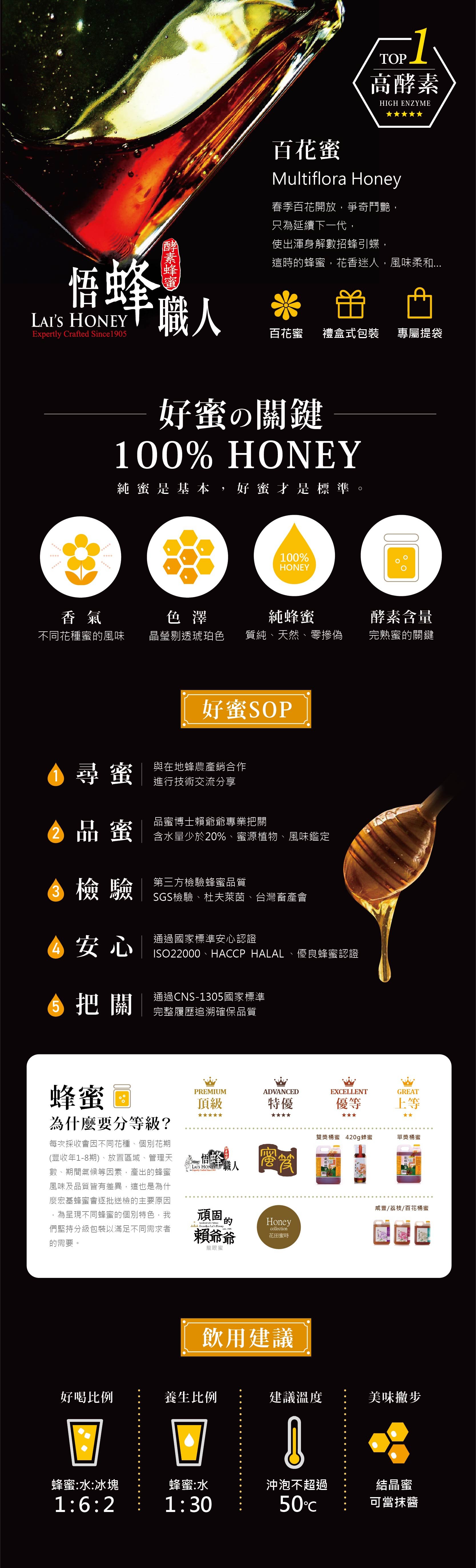 ●品名:悟蜂職人 百花蜜 560g《易結晶》●容量:560g/瓶●成分:蜂蜜●原產地:台灣●保存期限:二年 ●保存方法:常溫不宜冷藏、曝曬,請放置陰涼處存放,避免碰到水。 ●使用方法:可以冷、溫開水泡開,再加冰塊、果片。可和牛奶、咖啡調和或當抹醬、沾醬或調理。 ●注意事項:1.八個月以下幼兒不宜飲用。2.不與生石膏類食品、生甲殼魚類、生蠔類同食(間隔二小時)。3.蜂蜜為農產品,每批品質會隨氣候與環境而有所異。4.結晶乃晶種自然轉化,可寬心使用。